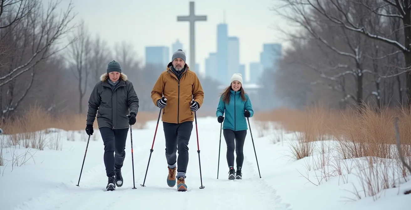 Au Québec, la technique de marche prend une dimension cruciale en hiver. La peur de glisser sur une plaque de glace peut paralyser même les marcheurs les plus motivés. La solution est d’adopter une technique spécifique pour les surfaces glissantes, souvent appelée la « marche du manchot ». Il s’agit de faire de petits pas, de garder les pieds légèrement écartés pour un meilleur équilibre et de poser le pied à plat plutôt que de dérouler du talon à la pointe. Gardez vos bras hors de vos poches pour qu’ils puissent vous aider à retrouver l’équilibre en cas de besoin. Anticiper et ralentir à l’approche des intersections ou des zones d’ombre où la glace se forme est également une compétence essentielle.